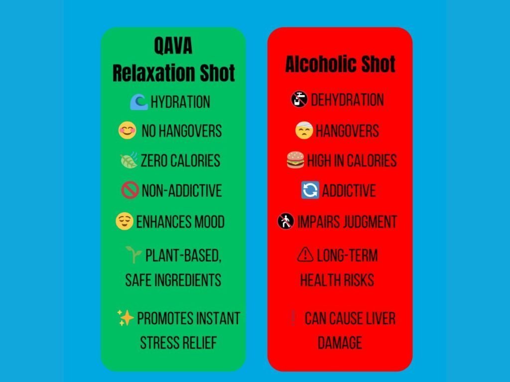 QAVA Relaxation Shot is designed to cater to the needs of modern consumers who seek effective relaxation without compromising their health. Unlike alcohol, QAVA Relaxation Shot offers numerous benefits: